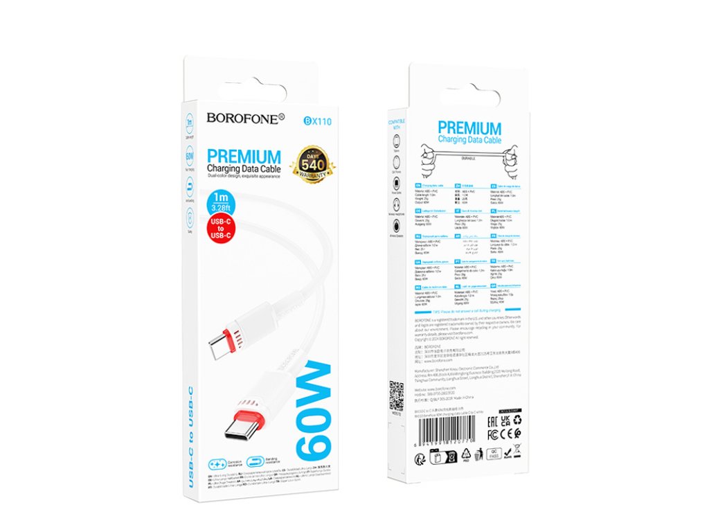 Kabel Borofone se dvěma koncovkami typu USB-C vám skvěle poslouží jak pro dobíjení, tak pro synchronizaci dat. Je kompatibilní s iPhonem, iPadem, MacBookem či dalšími zařízeními vybavenými USB-C konektorem. Podporuje rychlé nabíjení s výkonem až 60W. Zesílená konstrukce dodává kabelu vyšší odolnost vůči poškození způsobeného častým ohýbáním. Celková délka kabelu činí 1 metr.