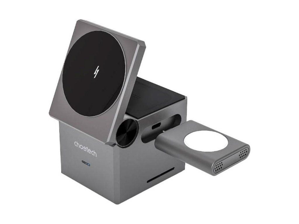 Moderní bezdrátová stanice s originálním designem ve tvaru kostky, která perfektně zapadne na každý stůl, aniž by ho zaplnila další směsí přebytečných kabelů. Multifunkční nabíjecí stojánek Choetech T632-F je schopen současně nabíjet váš mobilní telefon, sluchátka i chytré hodinky. Díky podpoře MagSafe můžete váš iPhone nabíjet jak ve vertikální, tak horizontální poloze. LED indikátor vám změnou barev podá informaci, zdali jsou připojená zařízení již plně nabitá. Samotný stojánek je napájen pouze jedním USB-C kabelem.